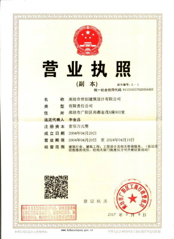 廊坊市世創(chuàng)建筑設計有限公司,原為廊坊市規(guī)劃設計院建筑工程設計所。成立于1997年,多年來本公司在社會各界人士的關心、支持下,不斷發(fā)展壯大。自2006年3月1日起具有國家建設部核準的建筑工程乙級設計證書,證書編號為:A213006026。企業法人營業執(zhí)照,注冊號:131003000011148 我公司自創(chuàng)建以來完成各類工業與民用建筑設計、咨詢項目共有三百五十多項,建筑面積近三百萬平方米,工程所在地涵蓋廊坊、天津、北京等地區。并有...